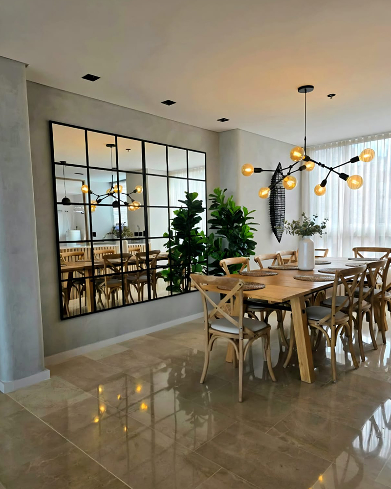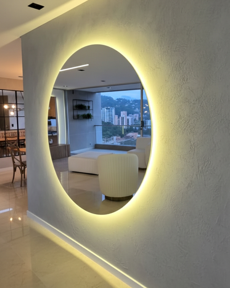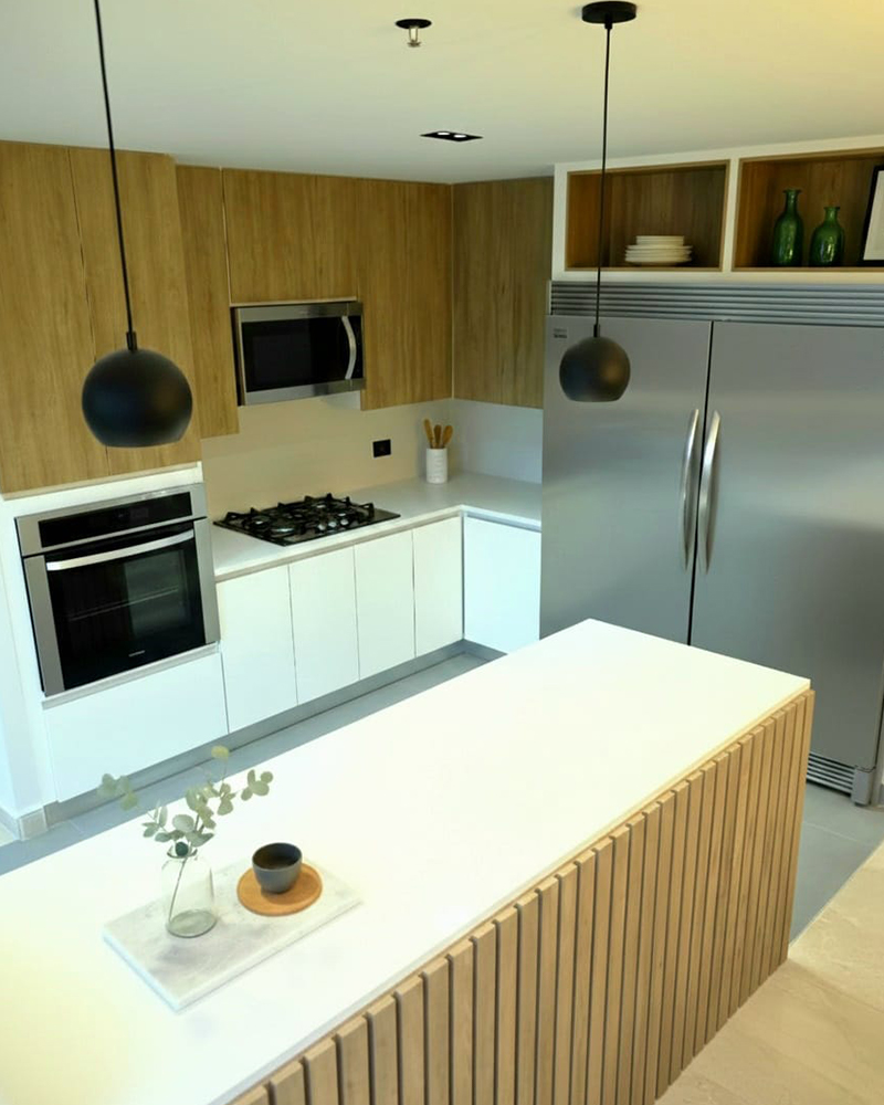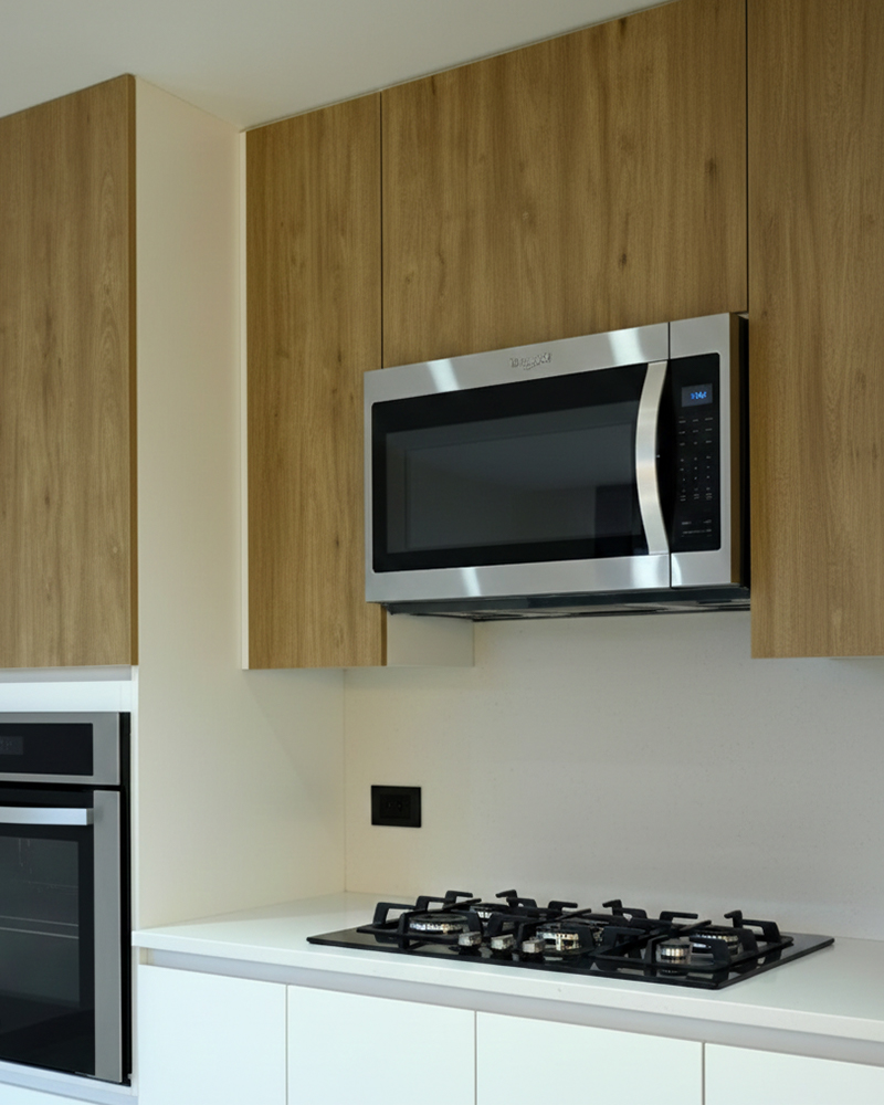 Uno de los elementos protagonistas del proyecto fue la incorporación de curvas en algunas paredes del área social. Estas formas, combinadas con el recubrimiento en microcemento, aportan textura, elegancia y un carácter contemporáneo al espacio.