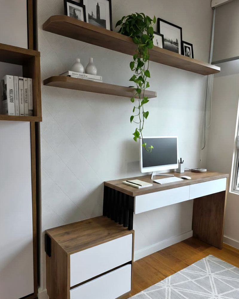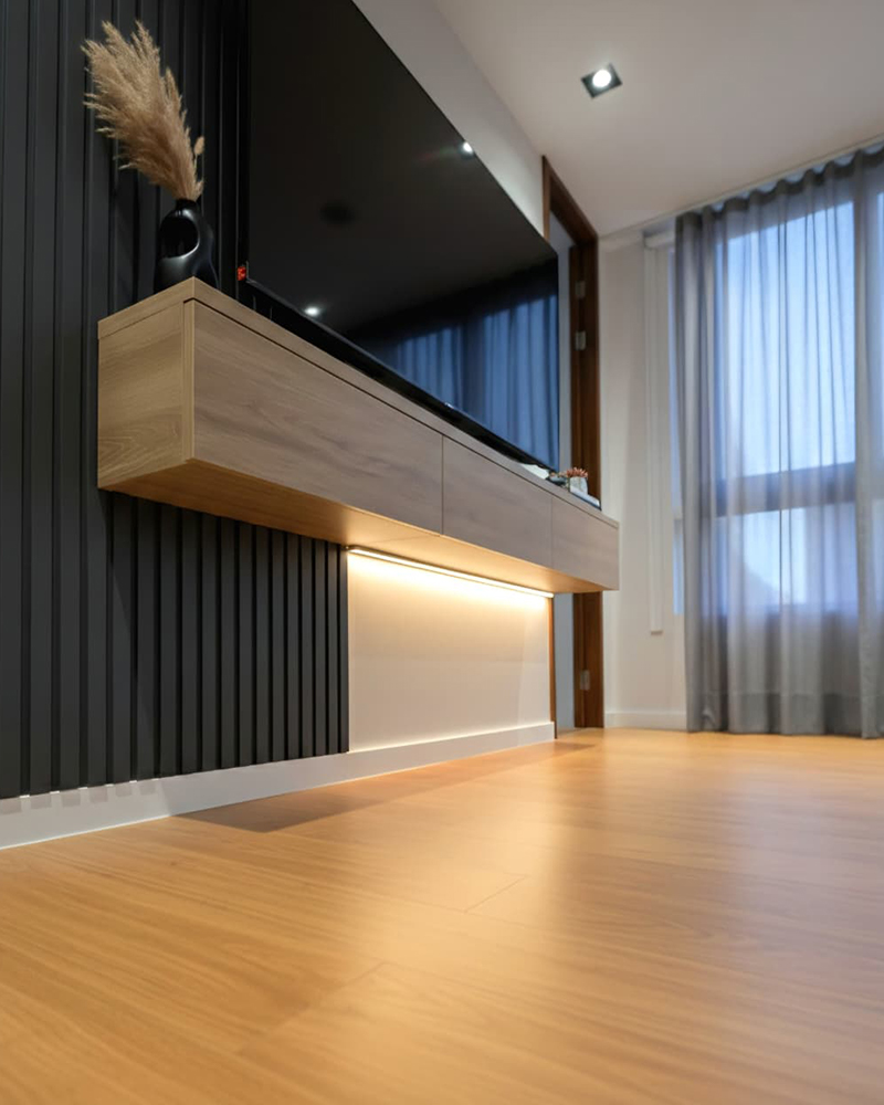 Para reforzar la identidad del apartamento, se aplicó un tono gris cálido en las paredes, creando una base neutra y sofisticada que resalta los elementos de diseño. Junto con la carpintería a medida realizada en diferentes áreas, se logró transformar un apartamento convencional en un espacio con intención, personalidad y una atmósfera acogedora.