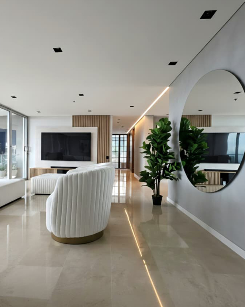 Intervenciones: diseño interior, curvas arquitectónicas, recubrimiento en microcemento, pintura general y carpintería a medida.