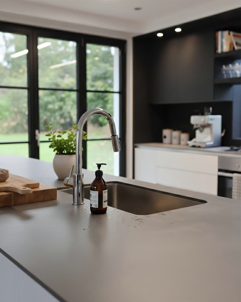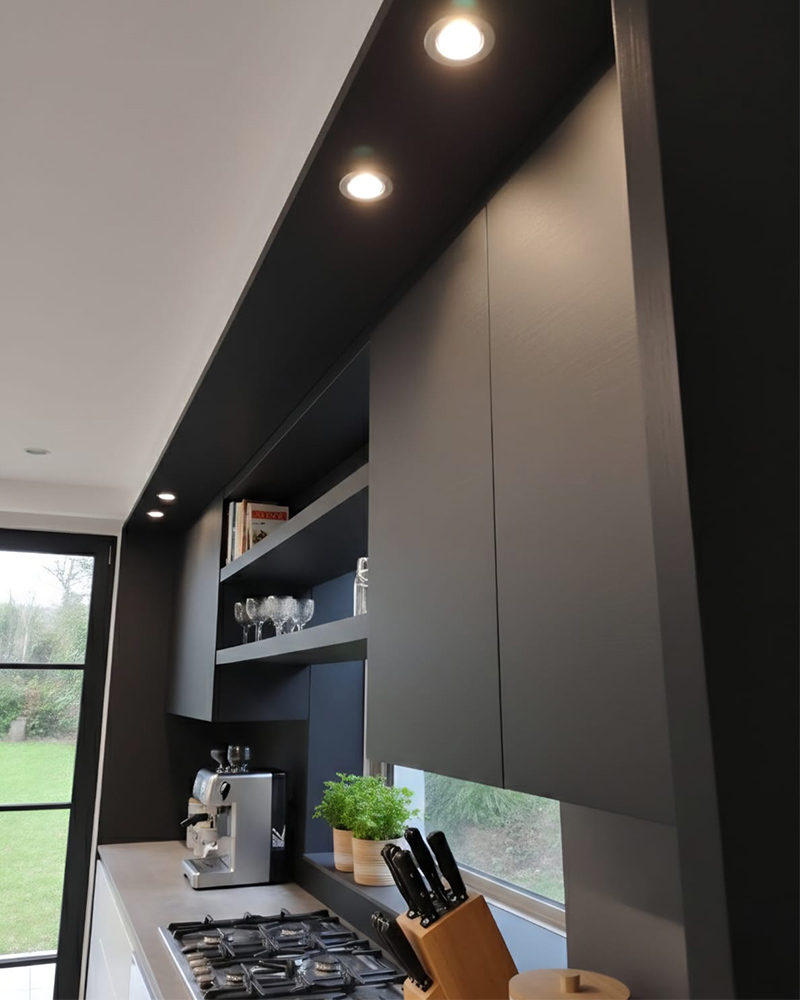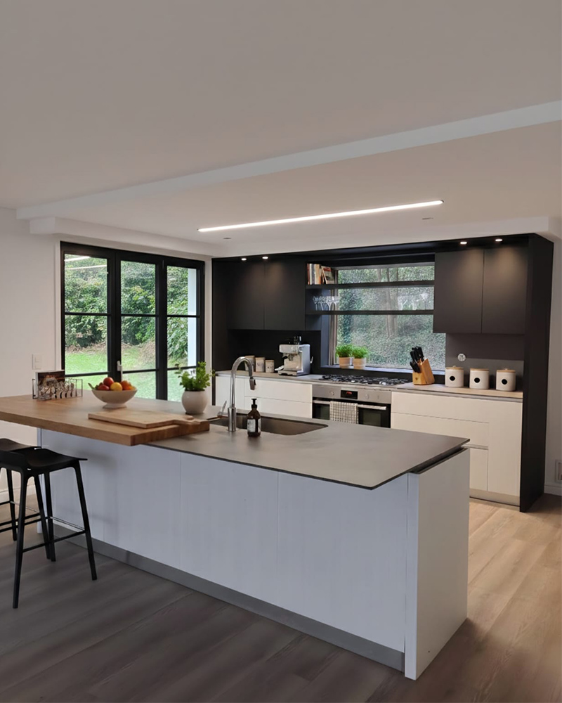 En la cocina, el contraste entre los módulos en negro mate y la isla social con barra de madera en voladizo crea un punto focal que combina carácter y funcionalidad.