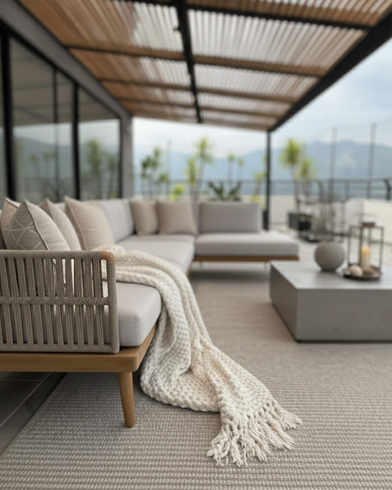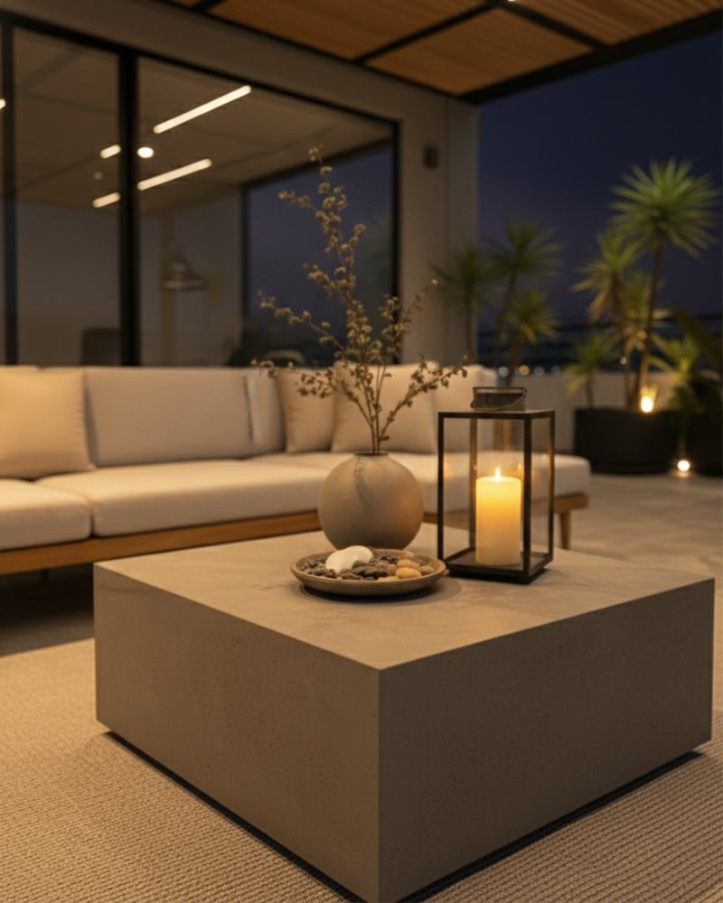 La intervención de la terraza comenzó con la fabricación e instalación de una pérgola arquitectónica en hierro, diseñada con líneas ortogonales que aportan estructura y un carácter contemporáneo. Para equilibrar la fuerza del metal, incorporamos listones de madera que filtran la luz de manera cálida, junto con un sistema de iluminación LED lineal y spots técnicos que crean una atmósfera envolvente durante la noche.