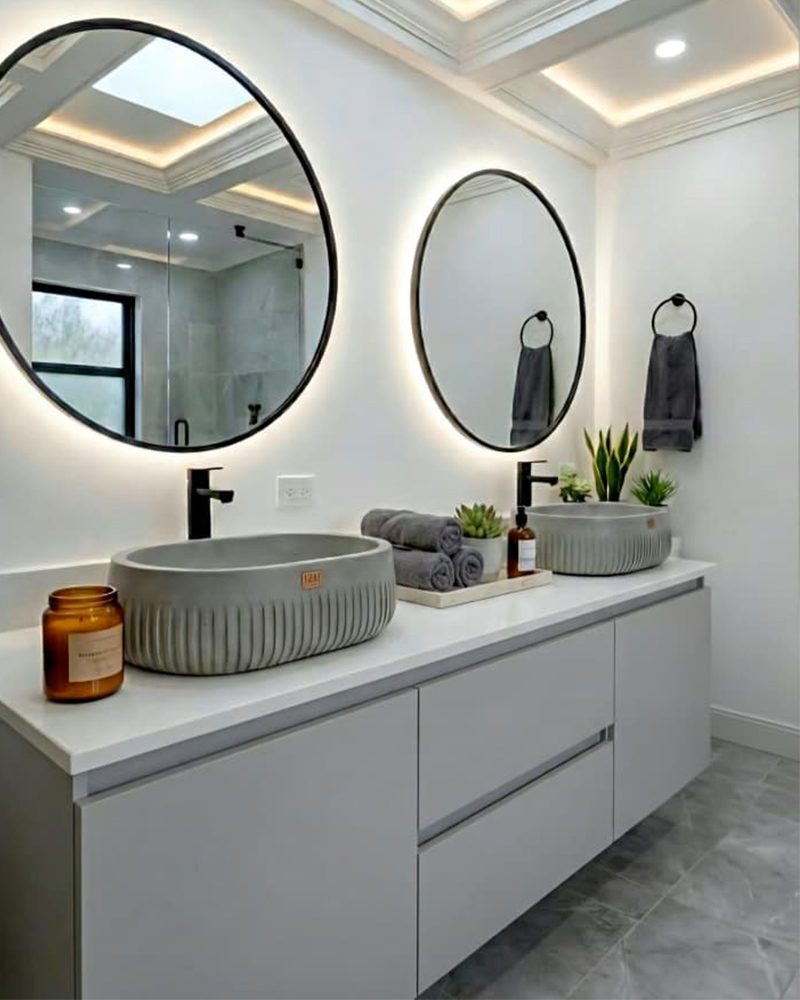 Por su parte, el baño principal fue concebido como un espacio de calma y sofisticación. Los lavamanos estriados en concreto, junto con la iluminación perimetral en techos y espejos, generan una atmósfera elegante que se integra armónicamente con la sobriedad del diseño general del proyecto.